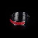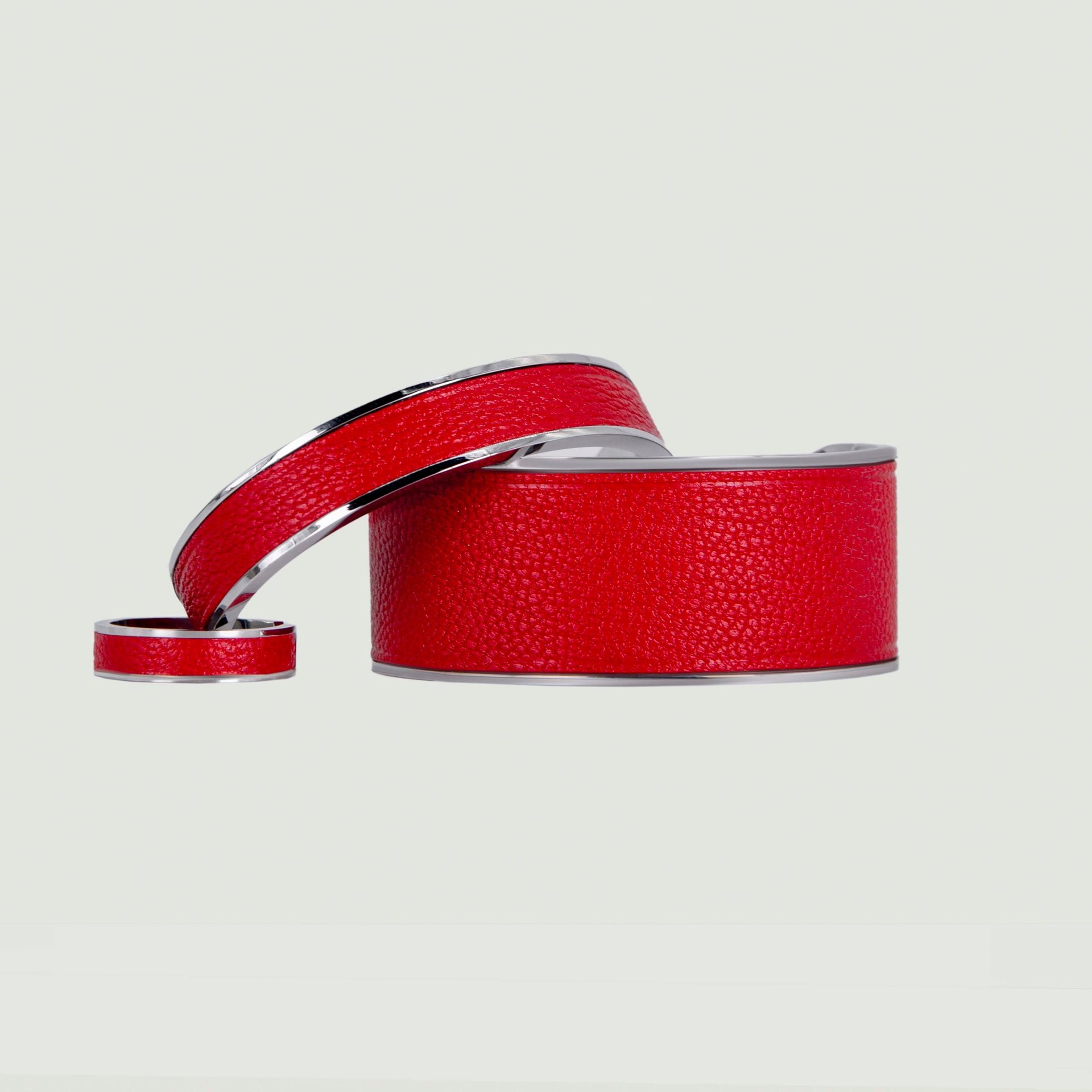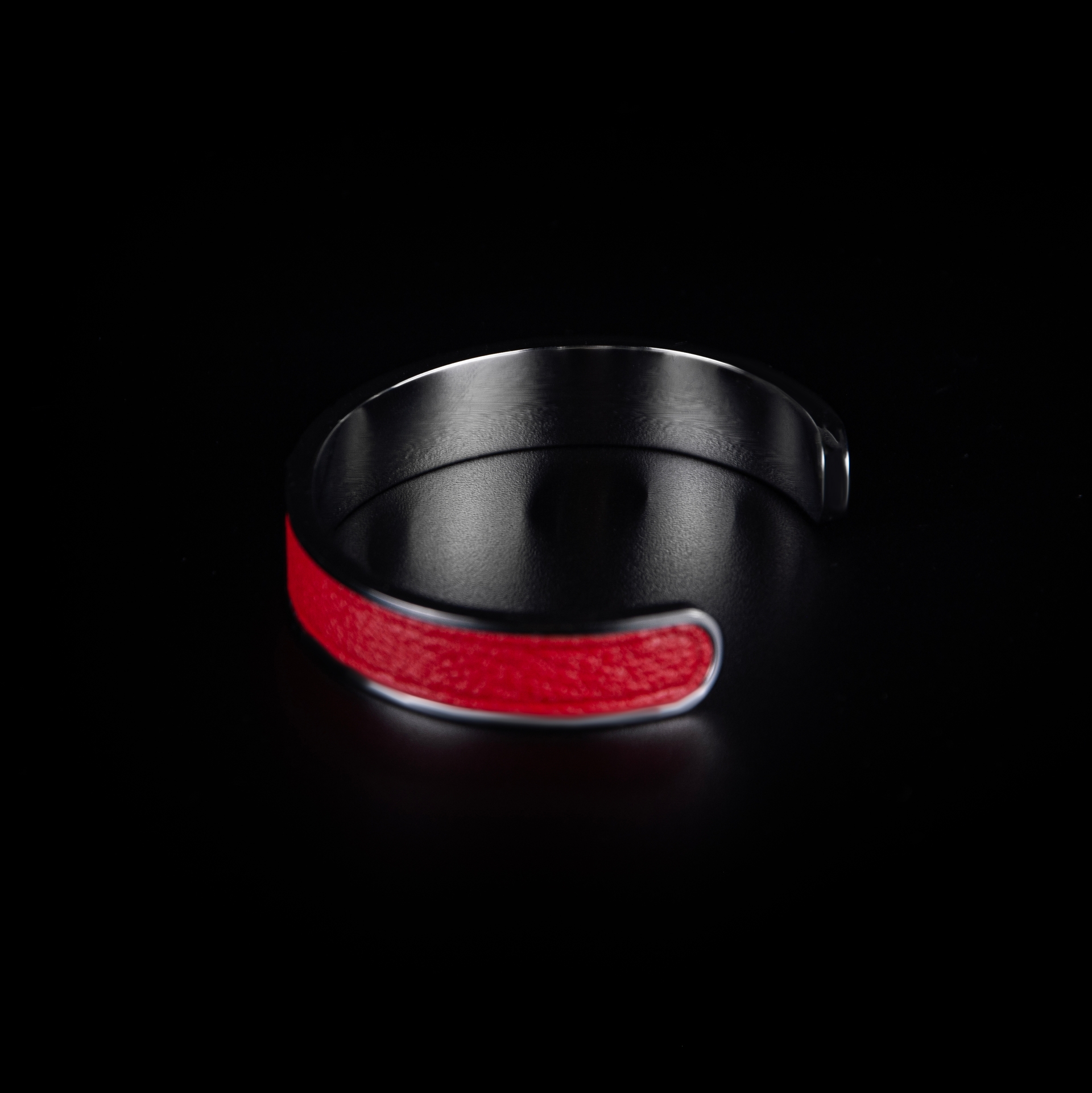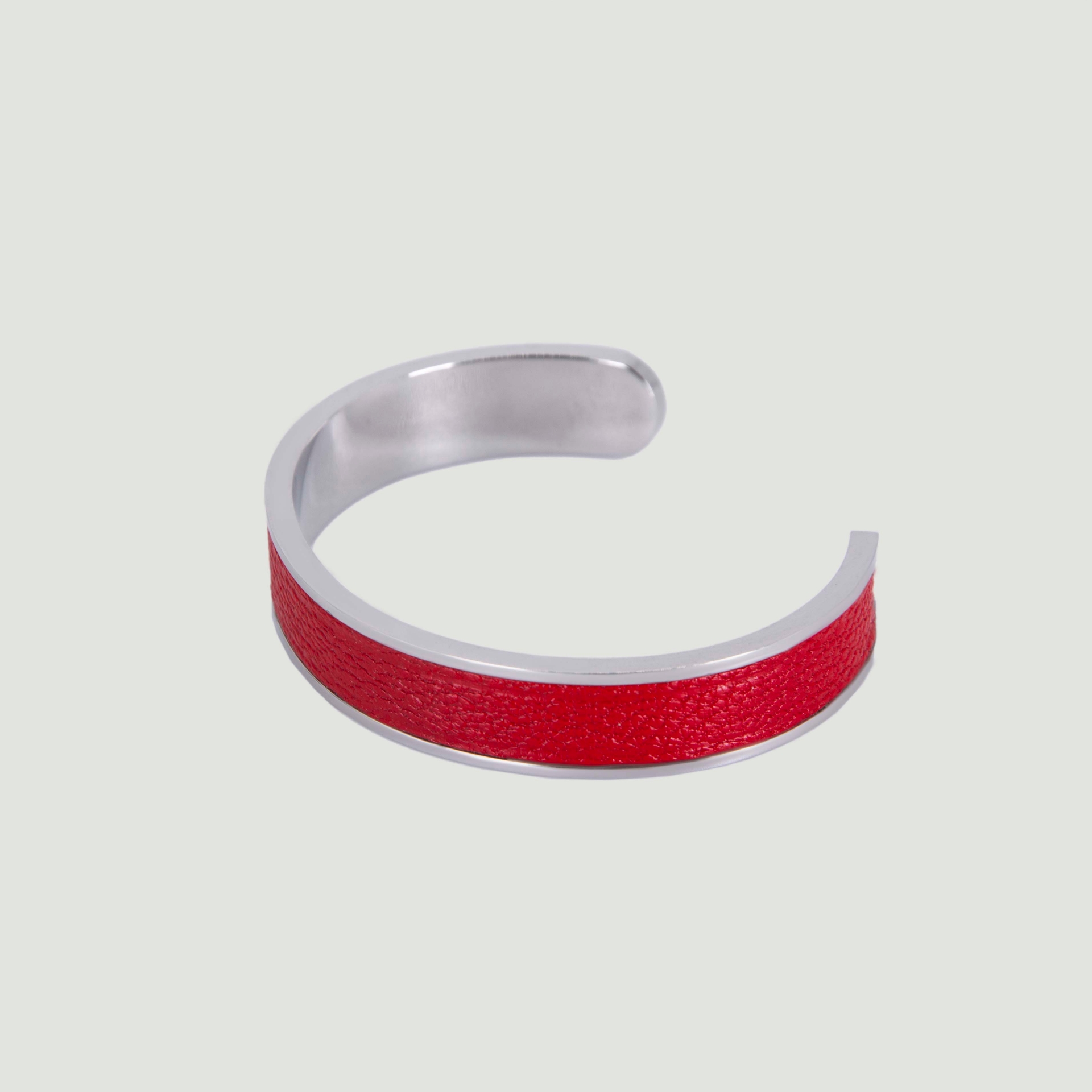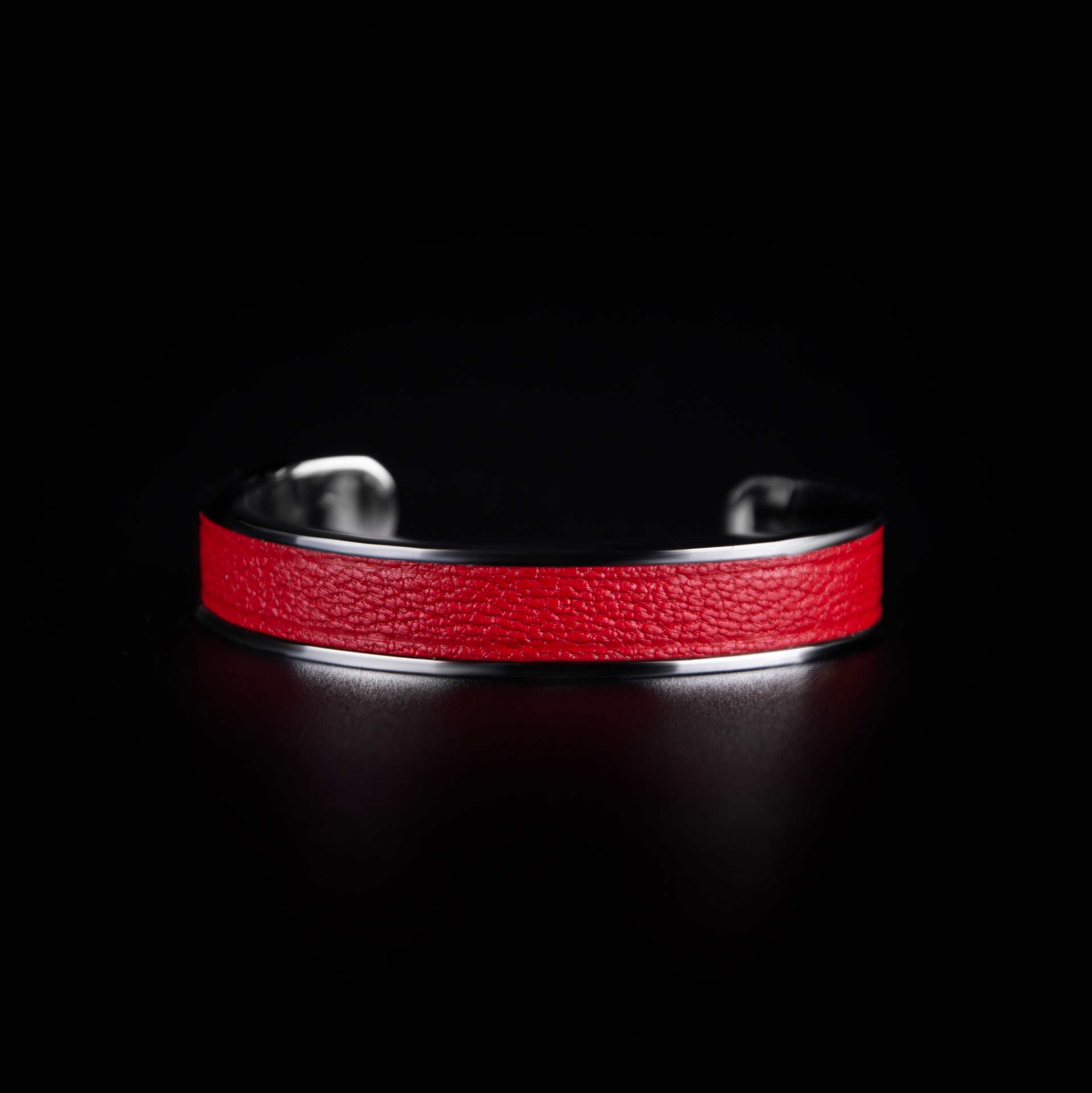 Средней ширины браслет с натуральной фактурной кожей красного цвета.