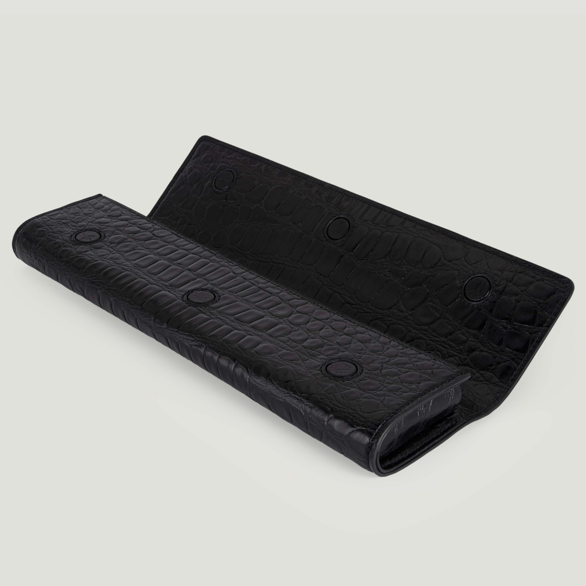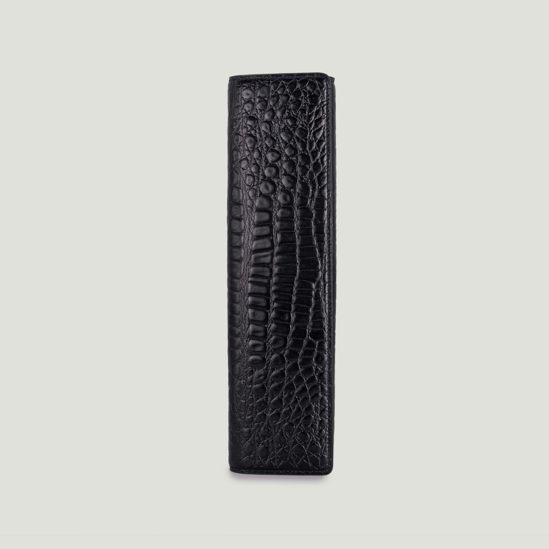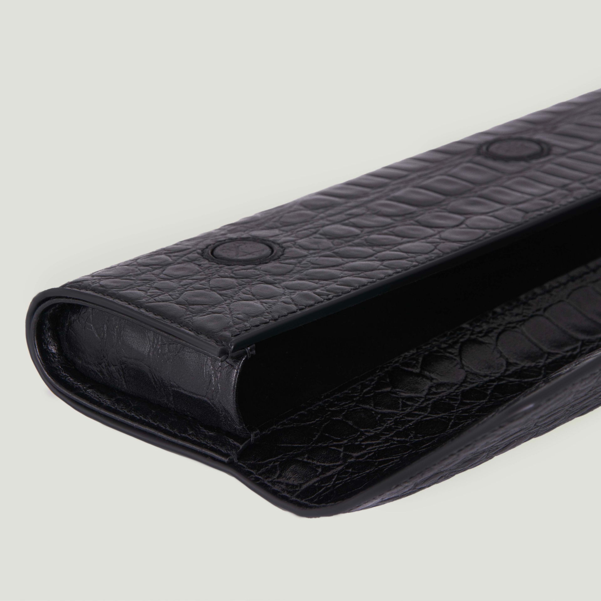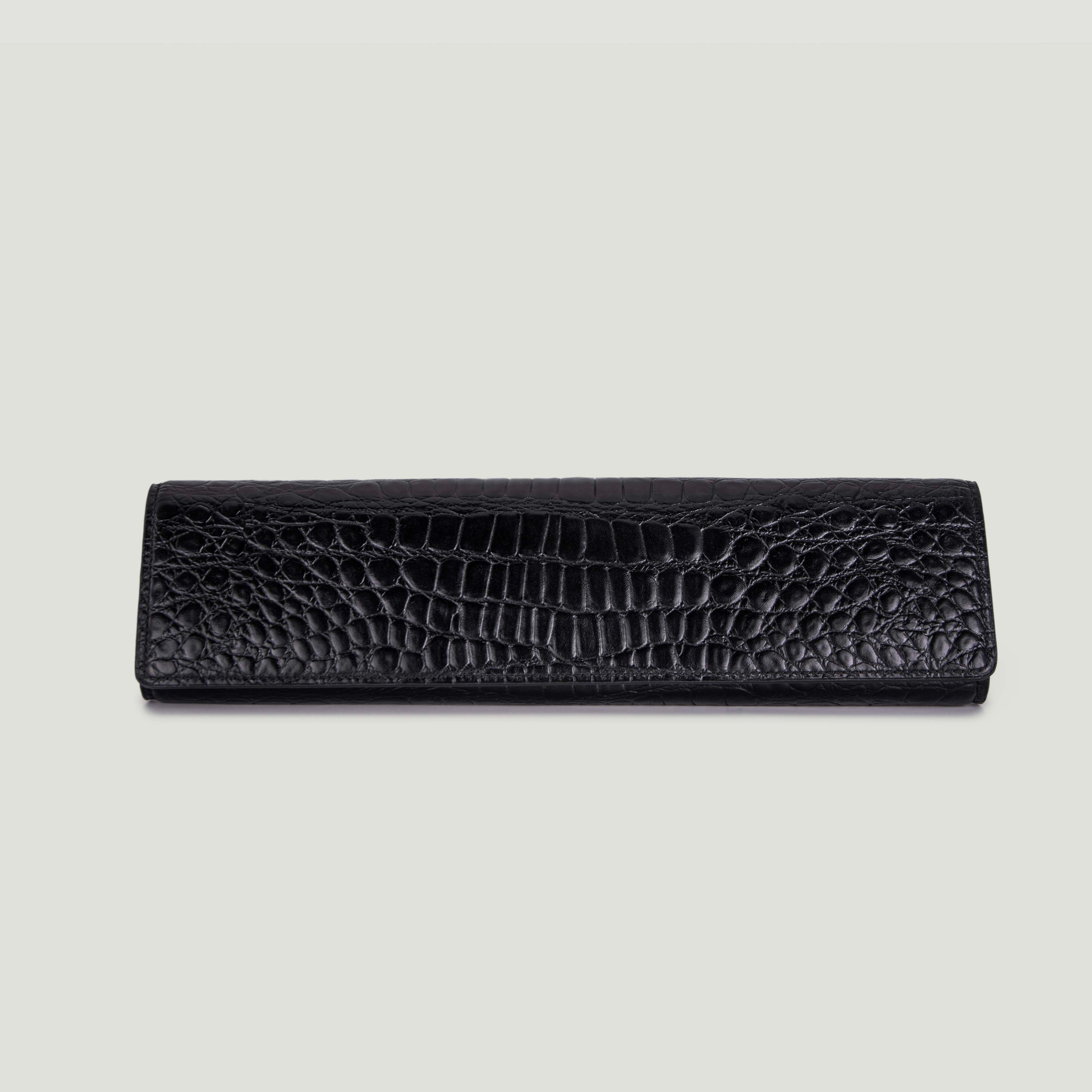 – Удлиненный клатч из черной кожи с крупной фактурой крокодила