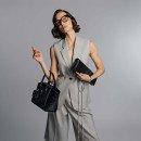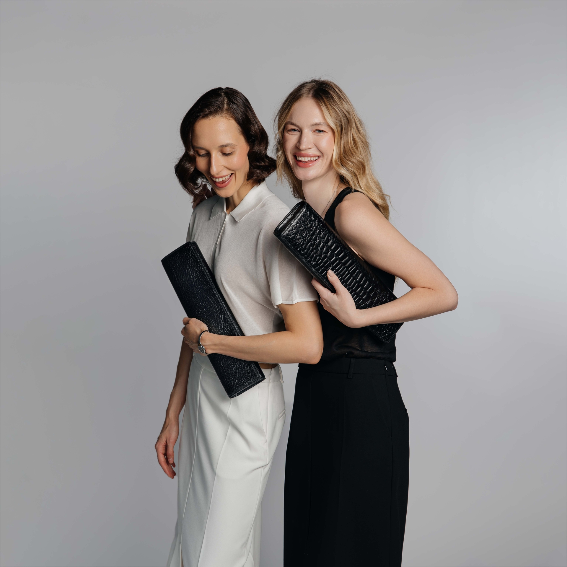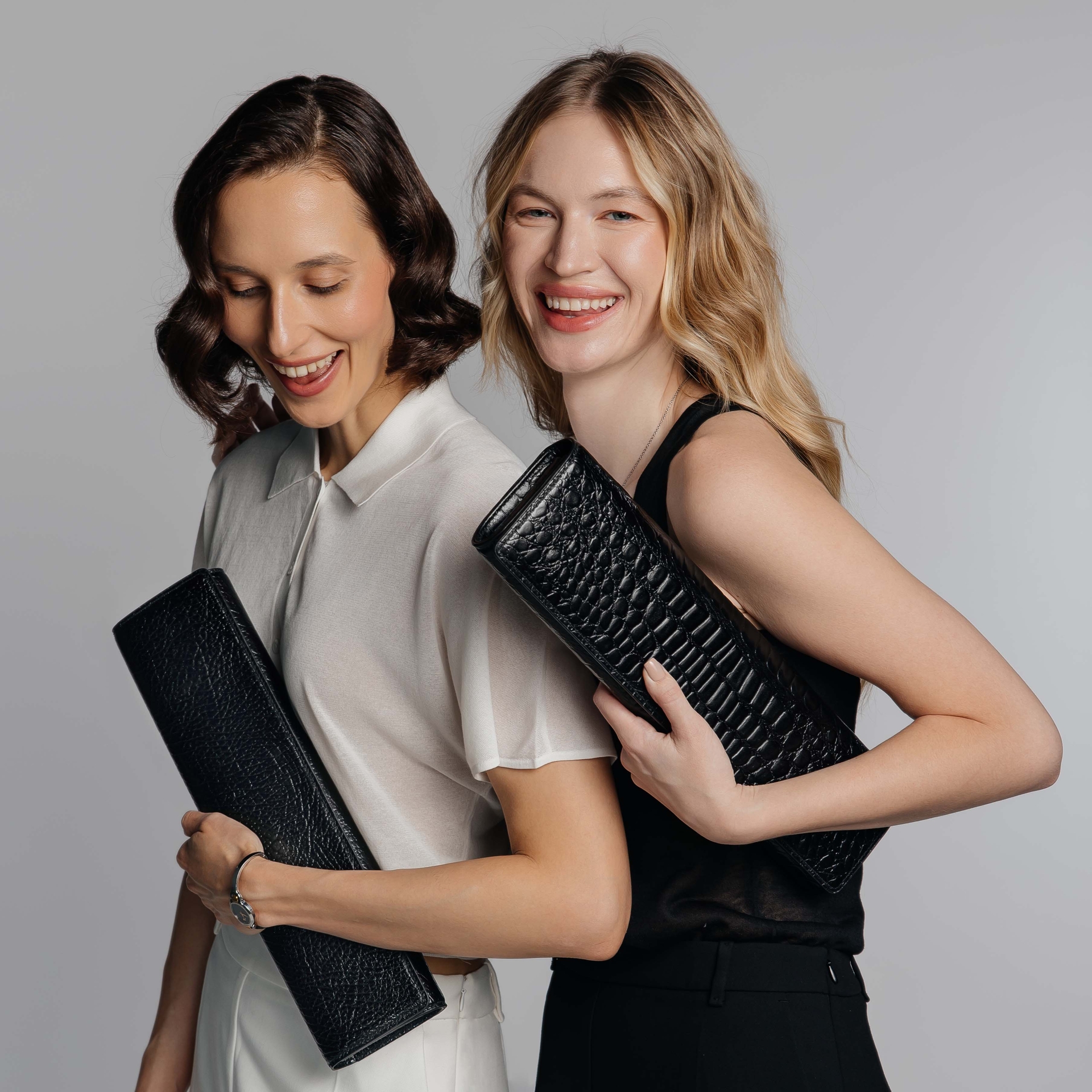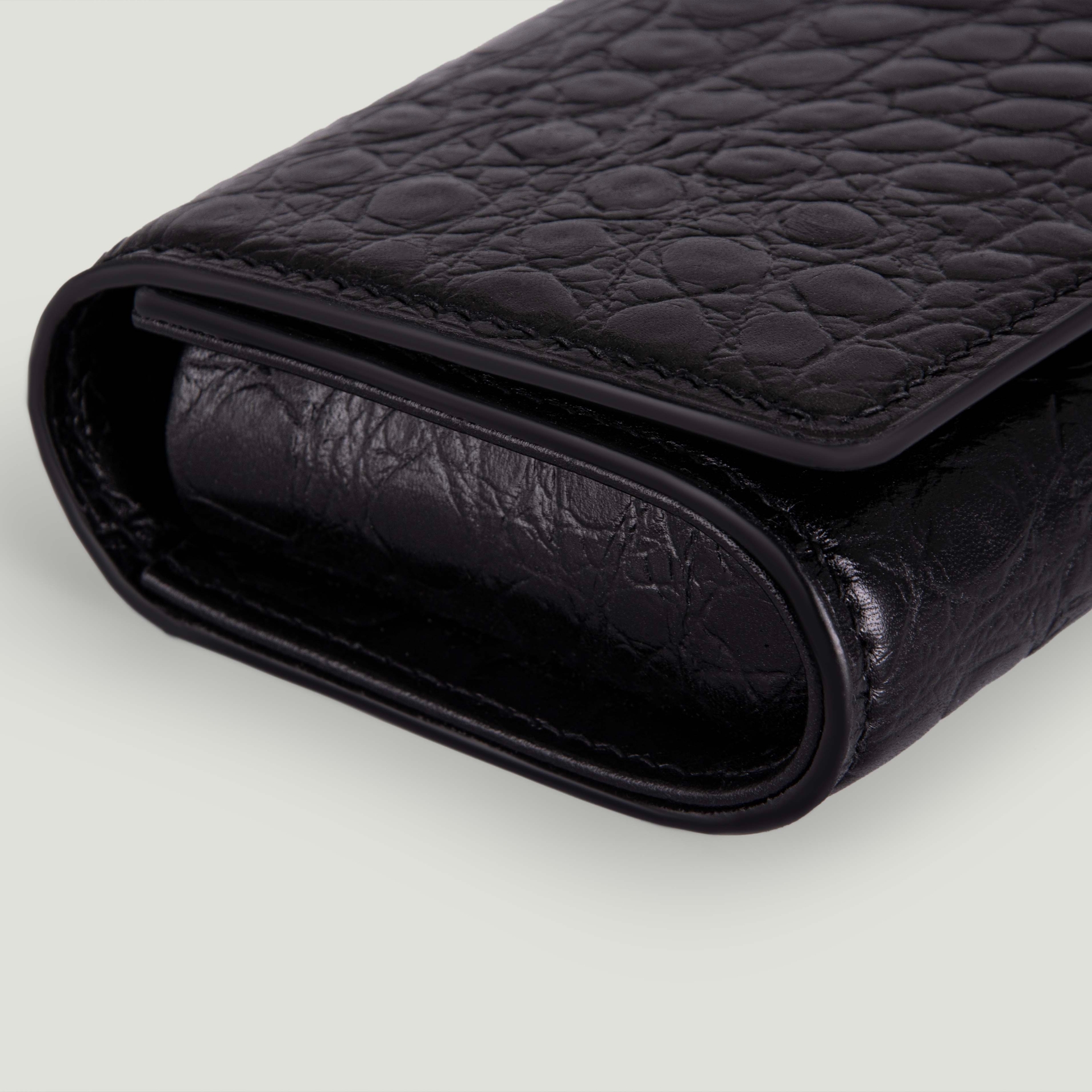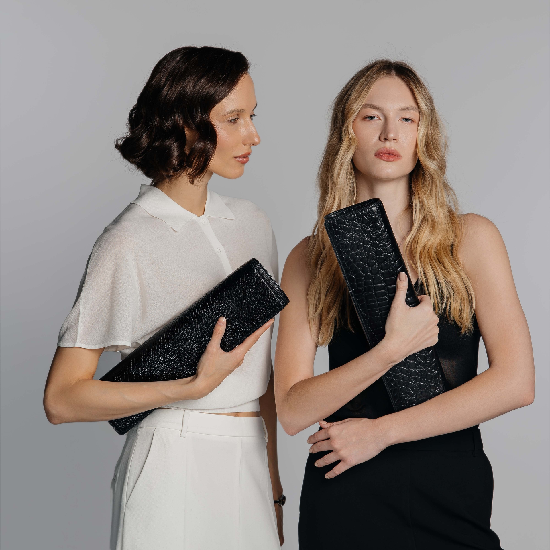 – Удлиненный клатч из черной кожи с крупной фактурой крокодила