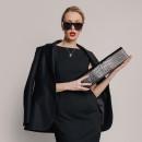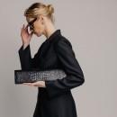 – Удлиненный клатч из лаковой кожи черного цвета с фактурой крокодила