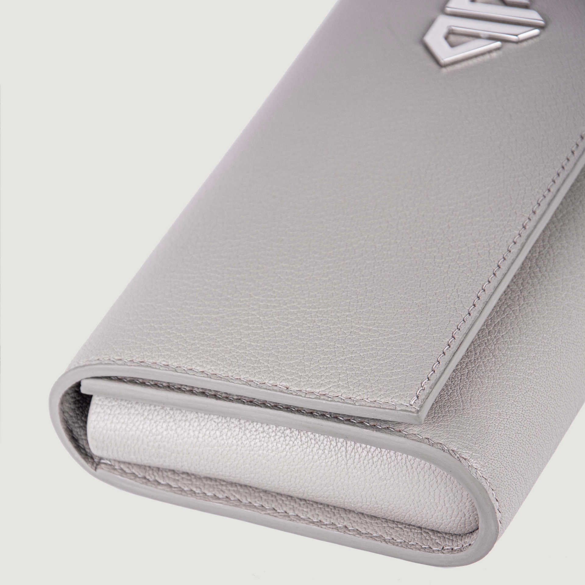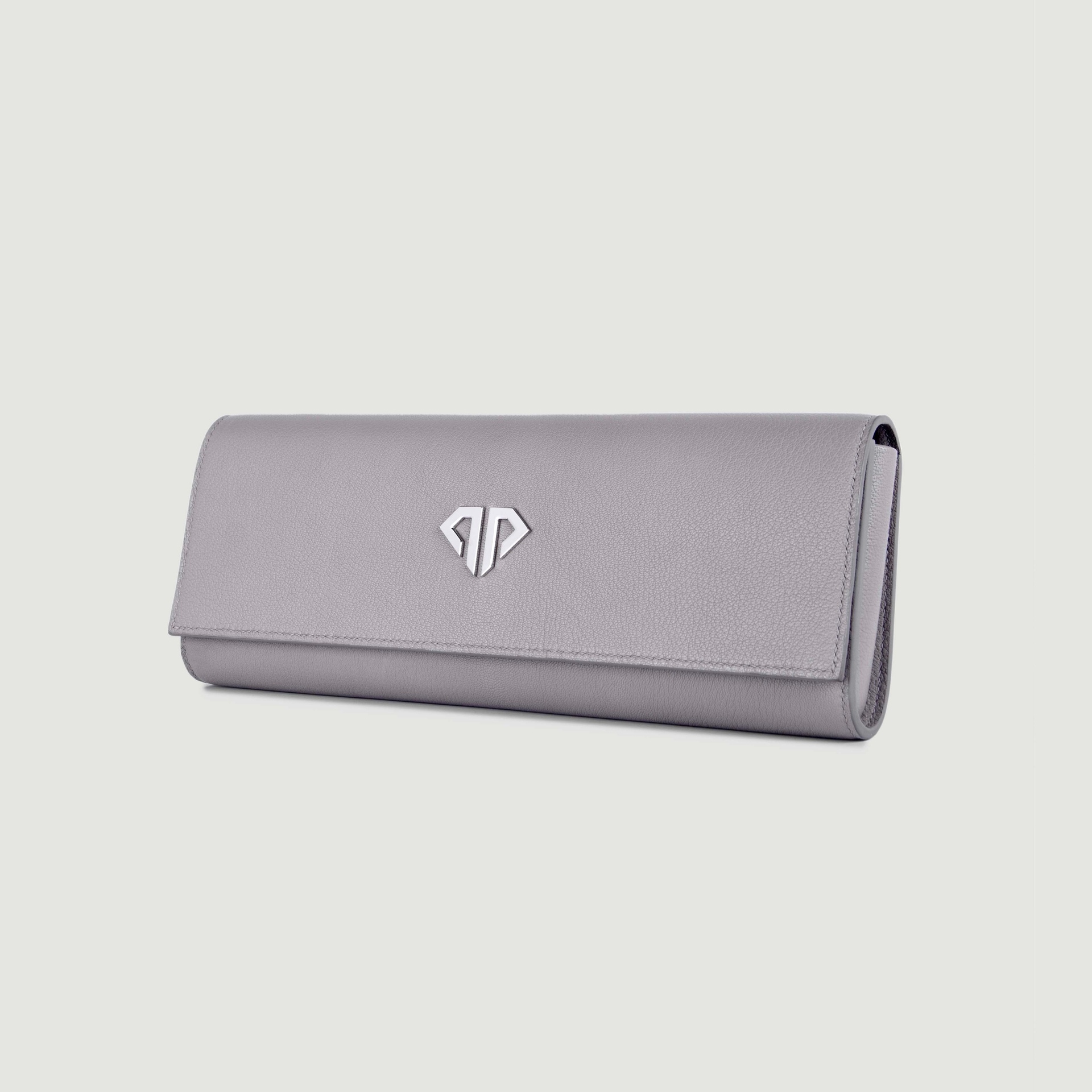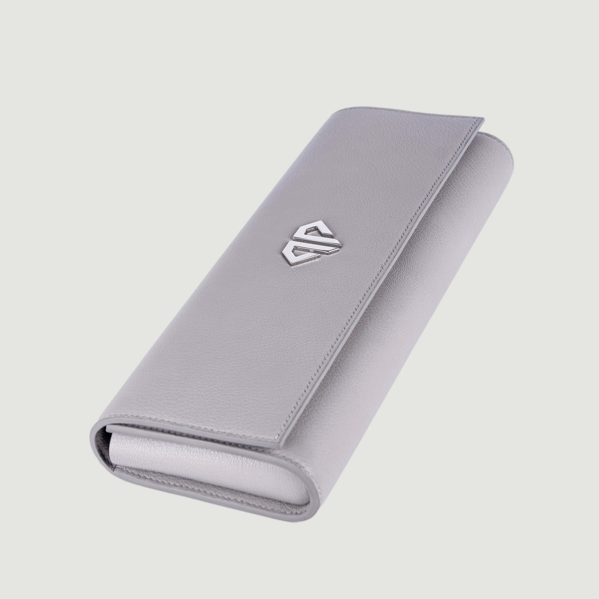 – Удлиненный клатч из фактурной натуральной кожи светло-серого цвета