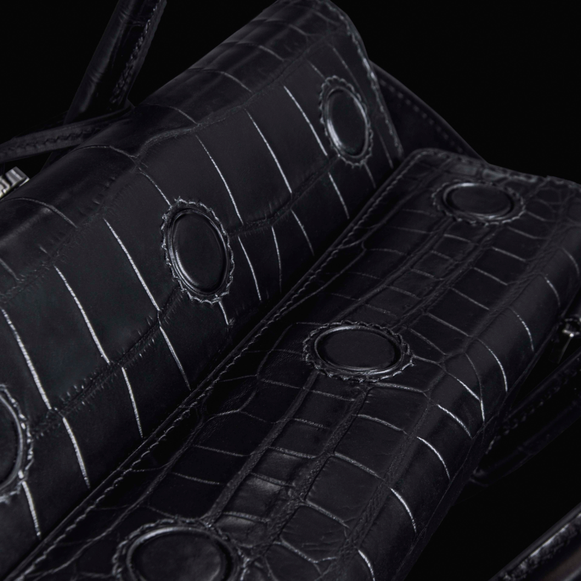 – Натуральная кожа черного цвета с фактурой крокодила
