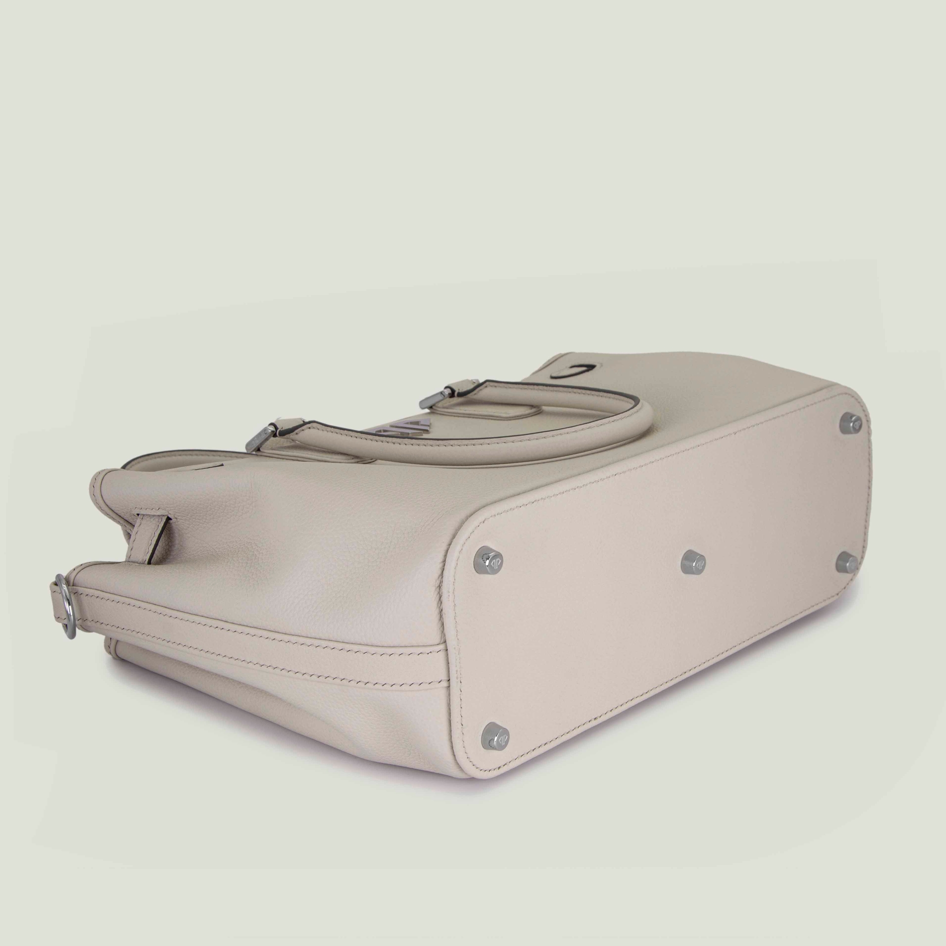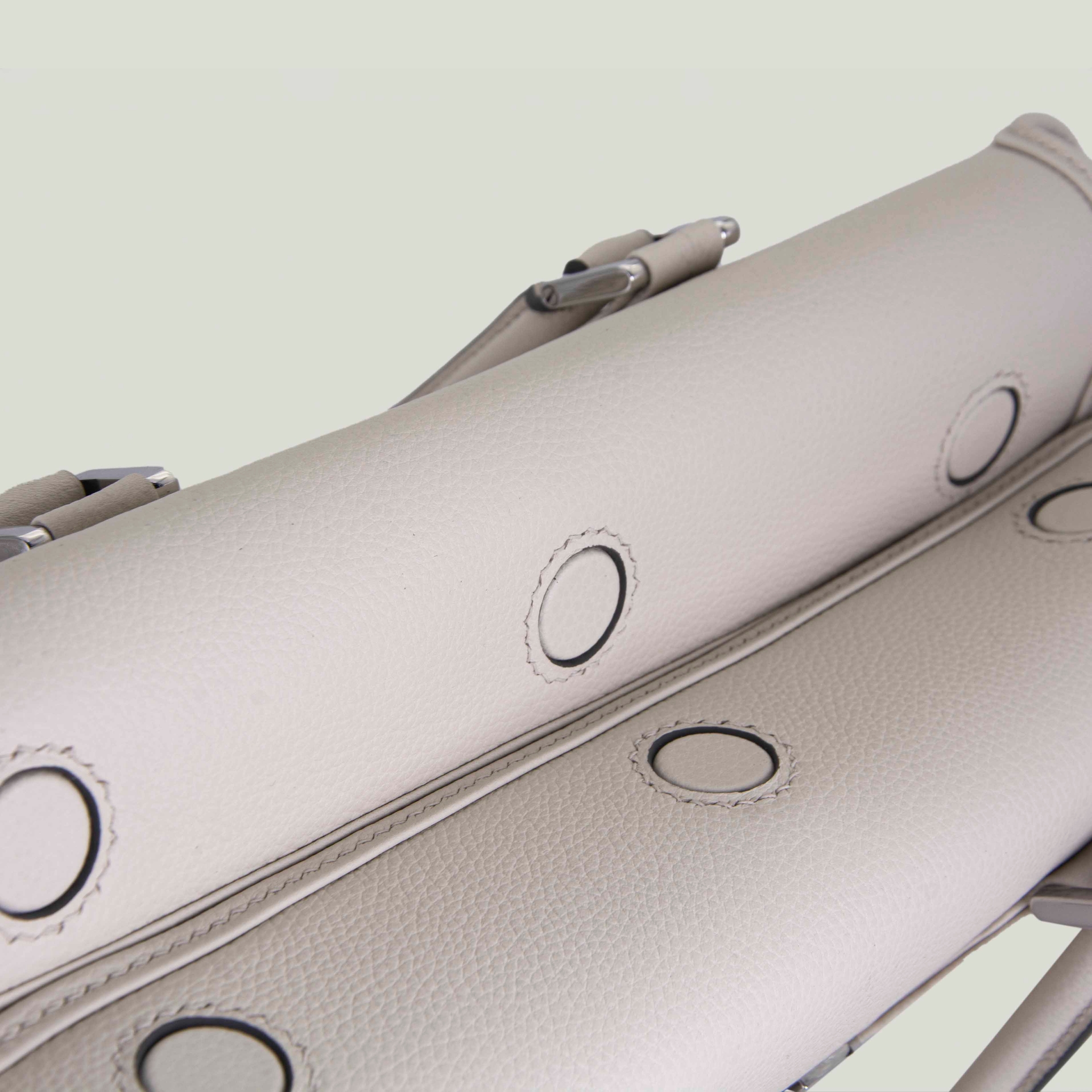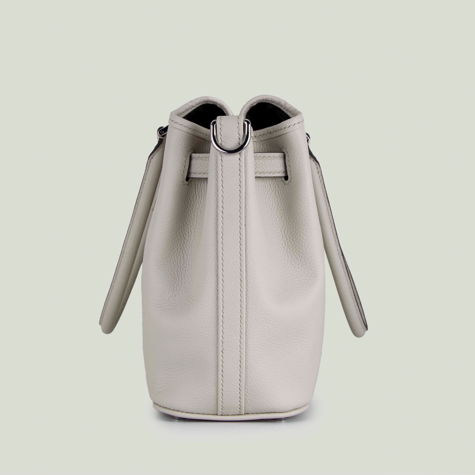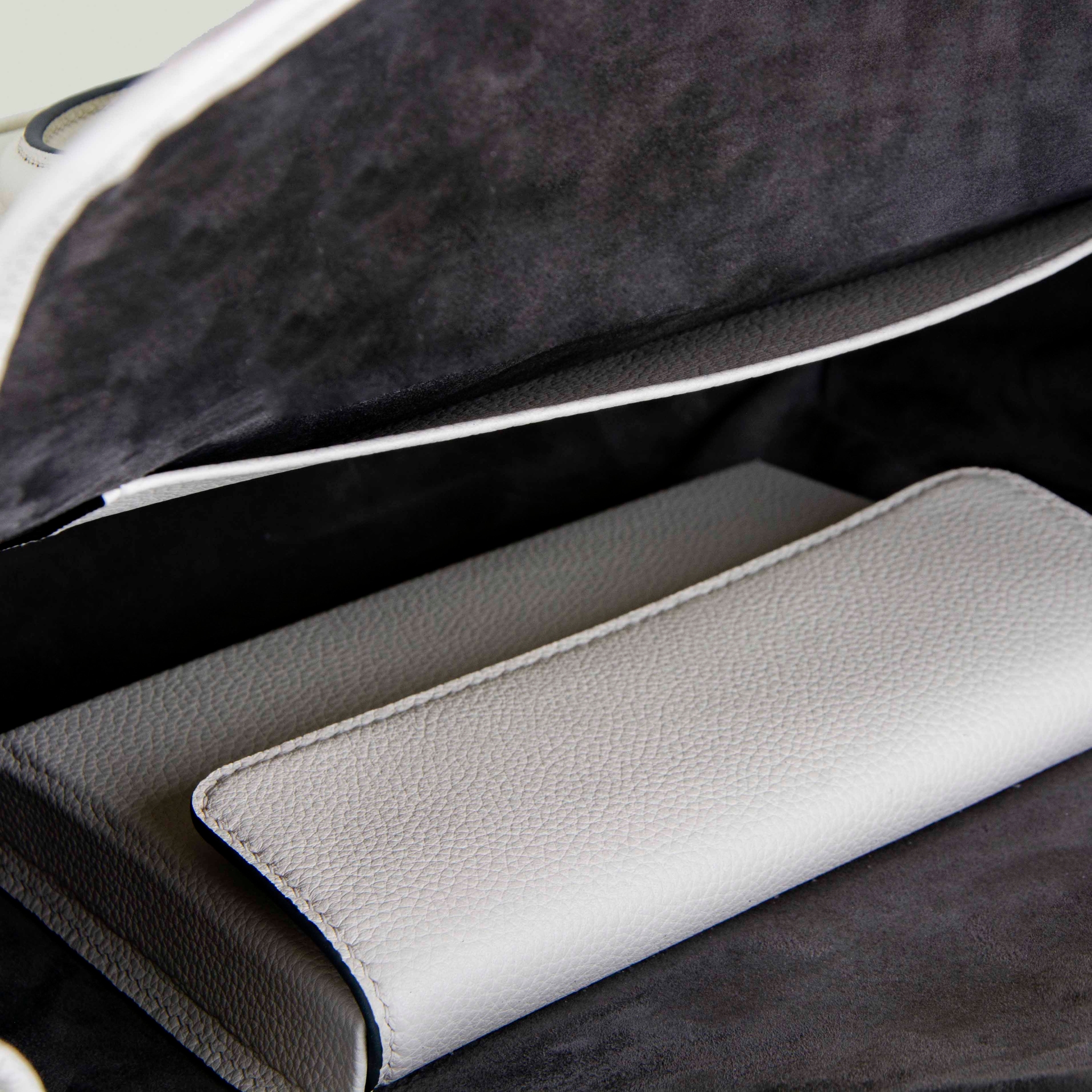– Натуральная фактурная кожа кремого цвета с серой строчкой