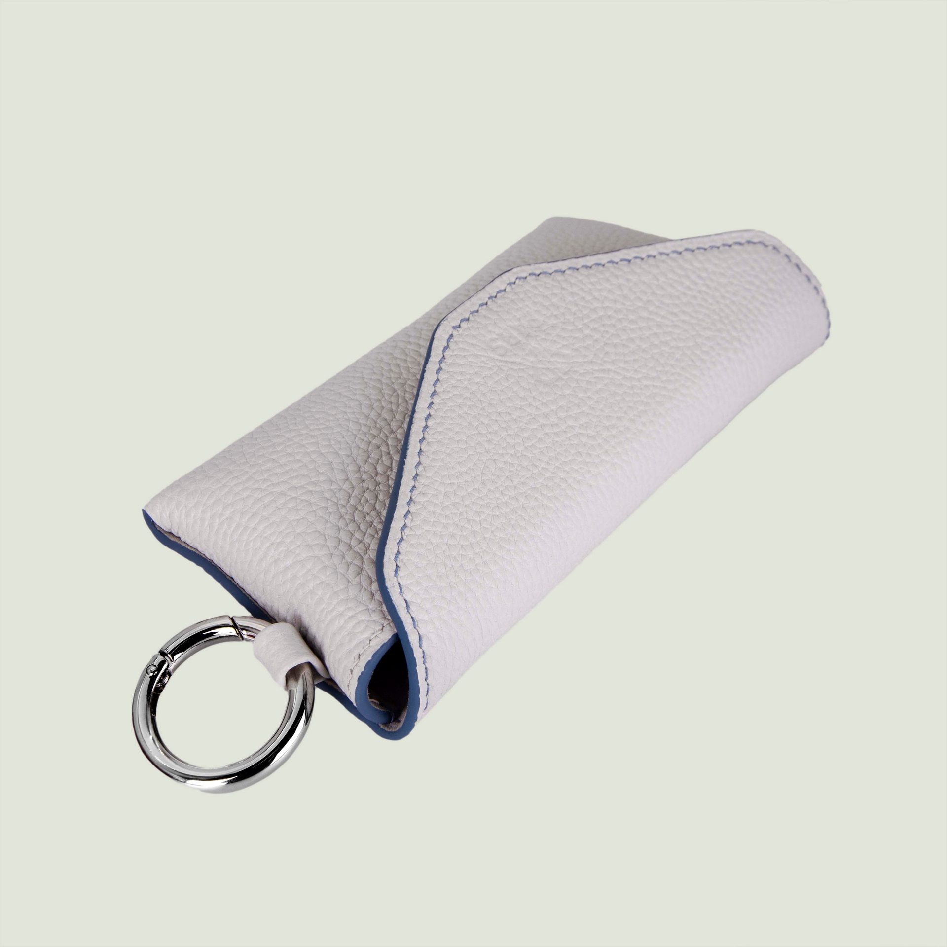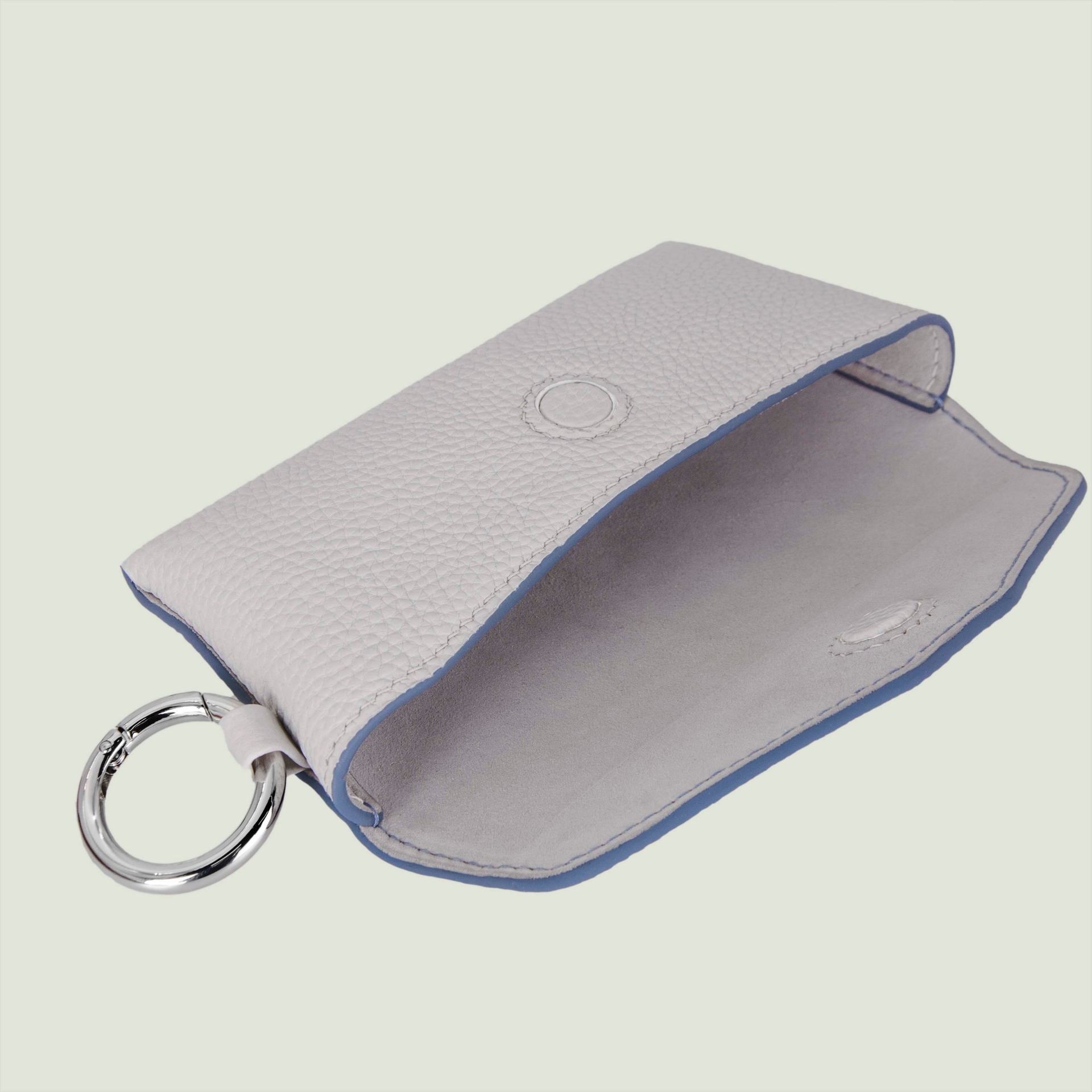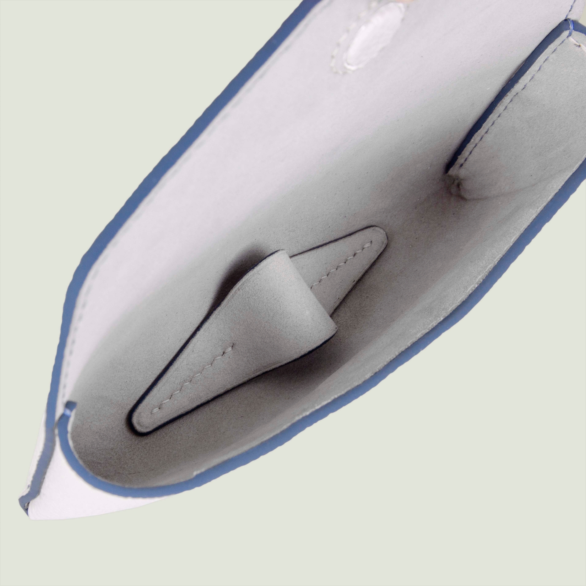 – Натуральная кожа светло-серого цвета с контрастными голубыми прокрасами
